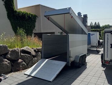 Die leichten Alu-Kofferanhängeranhänger sind serienmässig mit einer Ladeklappe und Heckstützen ausgerüstet.